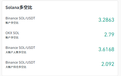 Solana 的衍生品市場處于極度、非理性看漲狀態(tài)。Binance 上的 SOL/USDT 多空比高達 3.2863,更值得警惕的是,大戶賬戶的多空比更是高達 3.6168。