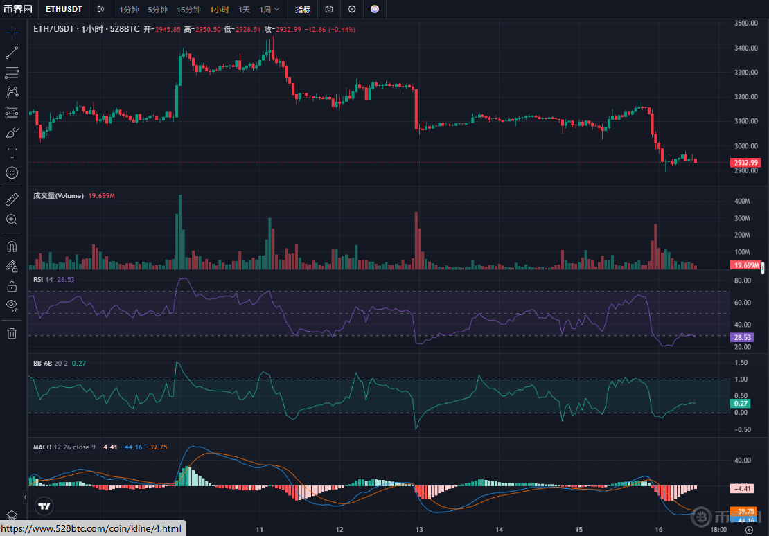 價(jià)格與成交量:ETH 價(jià)格小幅下跌(當(dāng)前 2927.99,1 小時(shí)跌 0.44%),1 小時(shí)成交量 19.69M 處于溫和水平 —— 說明下跌過程中拋壓不算極端,是短期情緒性回調(diào)而非大規(guī)模資金撤離;