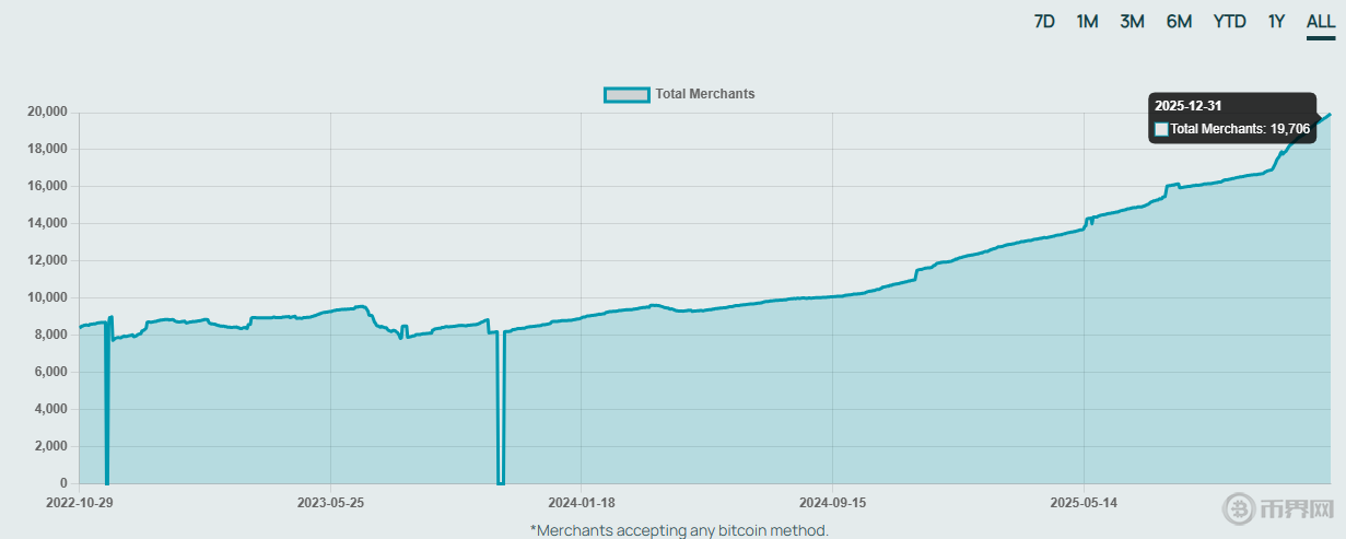 根據(jù)BTC Map 2025年度報(bào)告,接受比特幣支付的商戶總數(shù)從年初的約1.2萬(wàn)家增長(zhǎng)到近2萬(wàn)家,增長(zhǎng)率約為50%。更值得關(guān)注的是,近期驗(yàn)證的活躍商戶數(shù)量增加了53%,達(dá)到1.12萬(wàn)家,這表明新增商戶并非象征性嘗試,而是實(shí)際投入使用的商業(yè)決策。