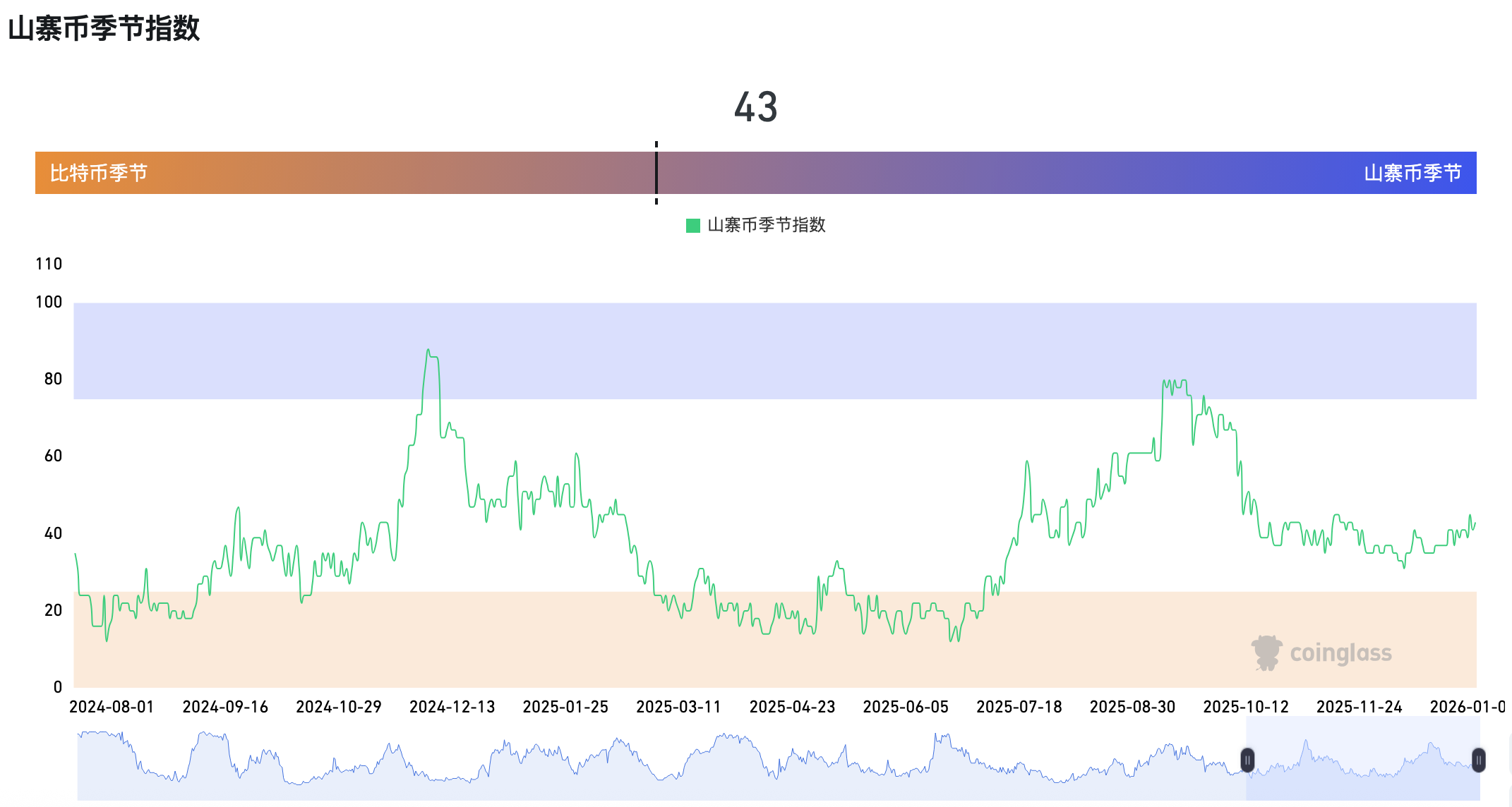 山寨幣季節(jié)指數(shù)(Altcoin Season Index) 在從底部的冰點緩慢爬升。Coinglass數(shù)據(jù)顯示,截至1月6日,山寨幣季節(jié)指數(shù)為43。加密市場恐懼與貪婪指數(shù)上升至45,轉(zhuǎn)為中性。