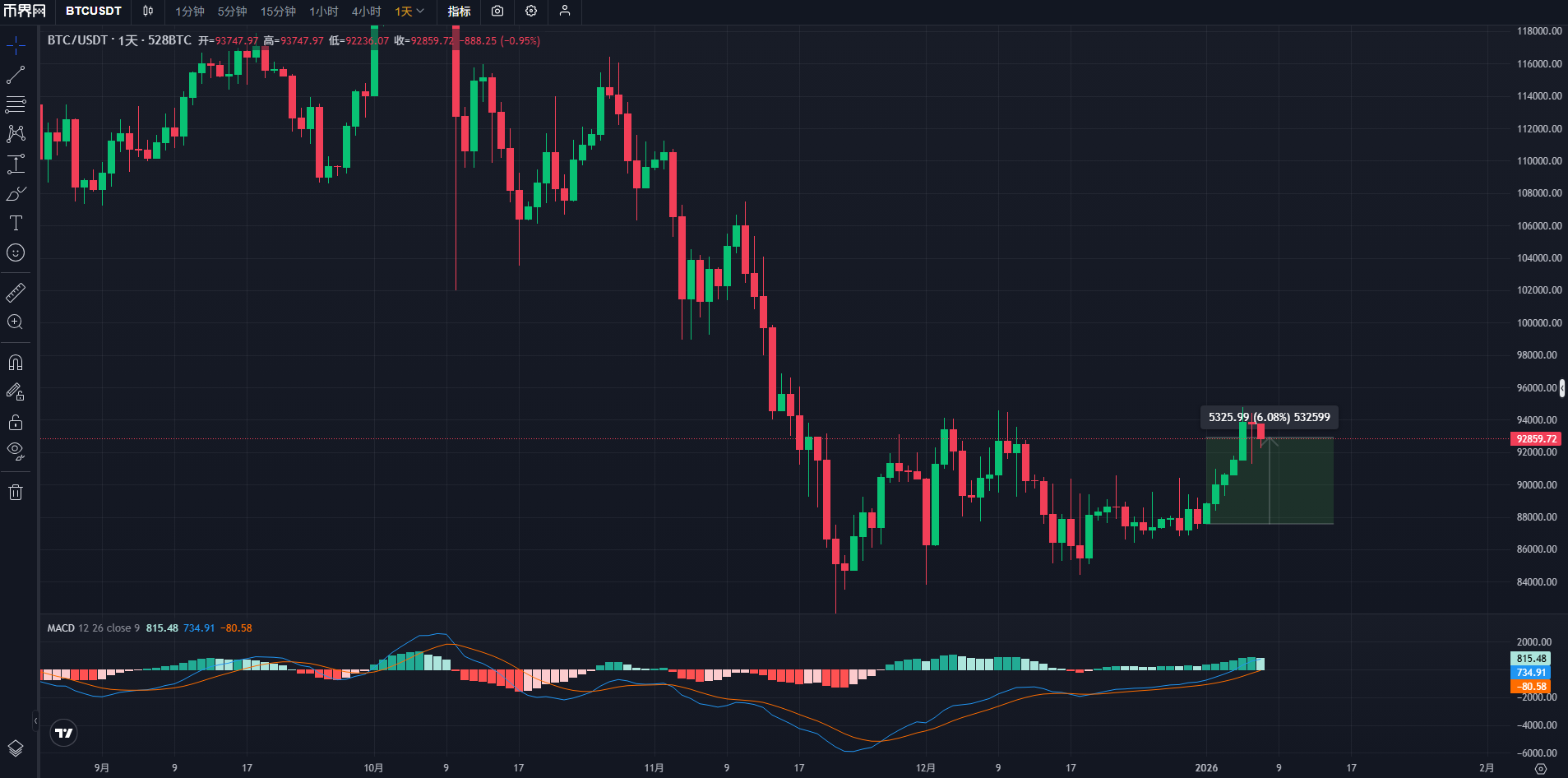 不過,令人欣慰的是,在進(jìn)入2026年后,比特幣市場(chǎng)似乎迎來了轉(zhuǎn)機(jī)。截至目前,比特幣價(jià)格已經(jīng)突破了9萬美元,撰寫本文時(shí),價(jià)格為92,859美元,新年后的第一周漲幅就超過了6%!