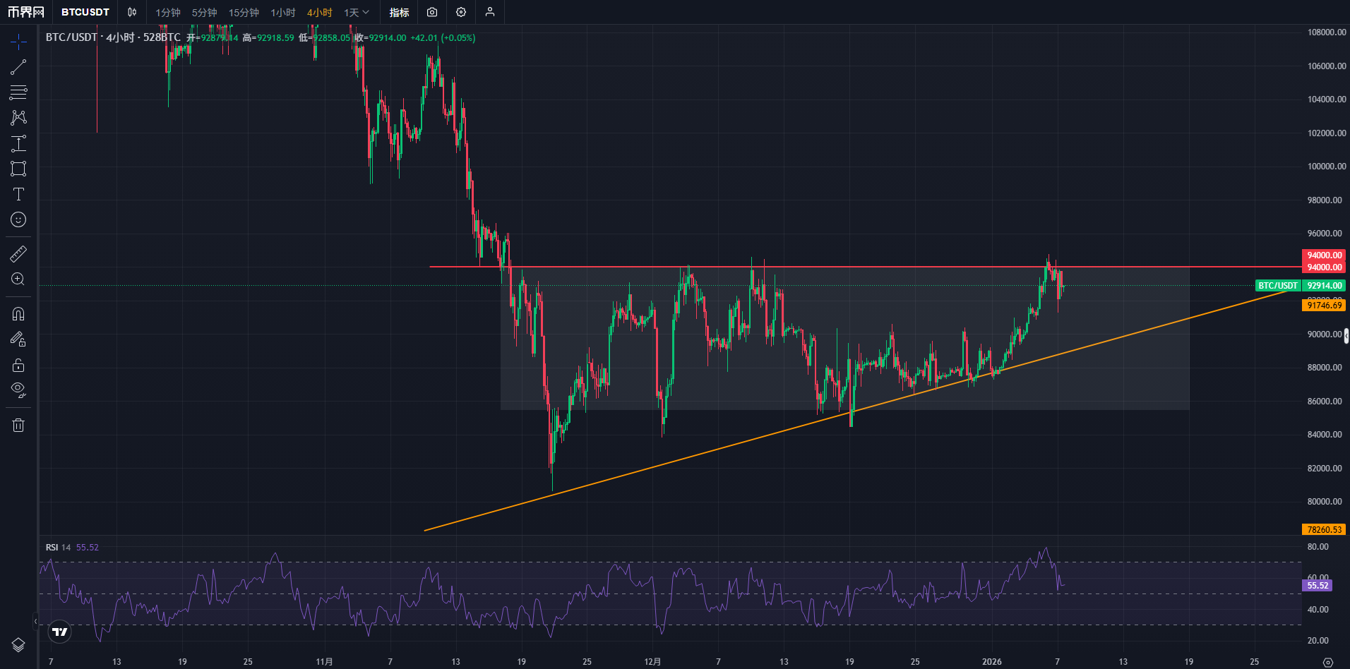 同時(shí),當(dāng)前比特幣的價(jià)格走勢(shì)仍處于寬幅震蕩箱體階段——92,000美元至94,000美元區(qū)間是該箱體的“天花板”。而94,000美元這一帶是比特幣當(dāng)前的關(guān)鍵壓力位,近期價(jià)格多次靠近這一水平,但始終未能有效突破,導(dǎo)致短線出現(xiàn)反復(fù)拉鋸的震蕩走勢(shì)。
