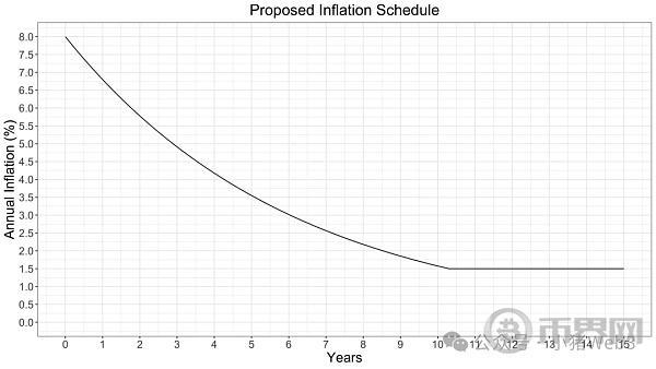 Solana 的初始通脹率為 8%,每年遞減率為 -15%,長期通脹率為 1.5%。