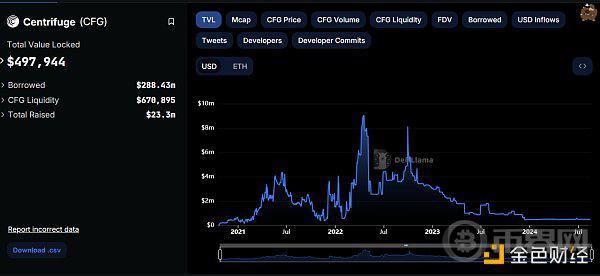 雖然 Centrifuge 項(xiàng)目在 RootData 的 RWA 項(xiàng)目關(guān)注度排行第一,但核心數(shù)據(jù)如 TVL 等卻在2022年熊市影響以及2024年項(xiàng)目預(yù)期落空等等因素的共同作用下一路下滑,目前僅有497944美元。
