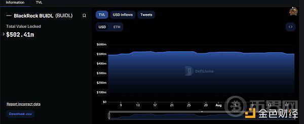在貝萊德公司本身實(shí)力和名望的加持下,BUIDL 基金在市場認(rèn)可度、TVL 等數(shù)據(jù)上非常不錯(cuò),TVL 穩(wěn)定在 502.41m 美元,RWA TVL Ranking 第4名。