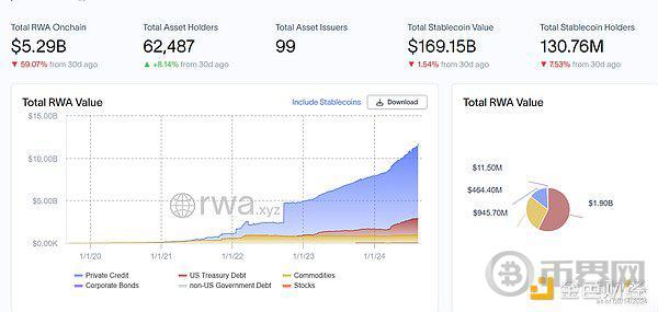 據(jù) RWA.xyz 官網(wǎng)數(shù)據(jù), RWA 相關(guān)資產(chǎn)持有者多達(dá)62487人,資產(chǎn)發(fā)行方數(shù)量為99,穩(wěn)定幣總價(jià)值1690億美元。