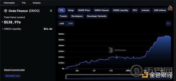 在 TVL 等關(guān)鍵數(shù)據(jù)上,ONDO Finance 在今年4月以來迎來顯著增長,目前高達(dá)538.97m 美元,在 RWA 賽道中排名第三。