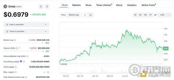 ONDO Finance 的市場表現(xiàn)同樣不俗,當(dāng)前項(xiàng)目代幣 ONDO 價(jià)格0.6979美元,與A輪融資價(jià)格0.0285美元、ICO融資0.055美元和開盤價(jià)格0.089美元相比,分布上漲2448%、1270%和784%,展現(xiàn)了市場對(duì)項(xiàng)目的狂熱追捧。