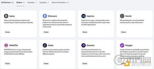 ONDO Finance 在歷史上進(jìn)行了三輪融資,共獲得融資3400萬美元,投資方有PanteraCapital、CoinbaseVentures、TigerGlobal、Wintermute等等知名機(jī)構(gòu)。除此之外,ONDO Finance 在鏈支持、資產(chǎn)托管、流動(dòng)性支持和服務(wù)設(shè)施四個(gè)領(lǐng)域有多達(dá)82個(gè)合作伙伴。
