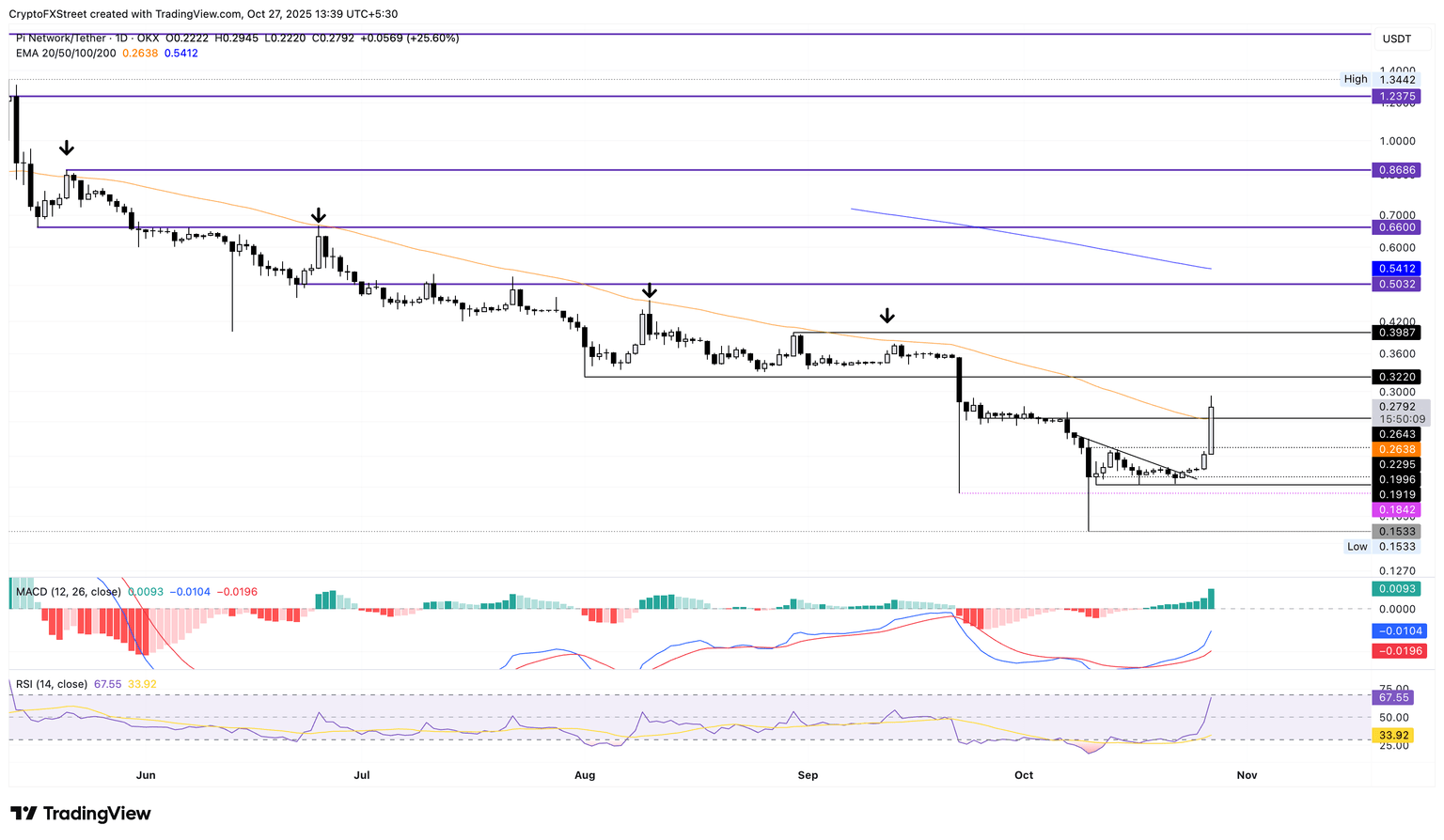 如果 PI 代幣未能維持在 0.2368 美元以上,則可能會重新測試 10 月 11 日低點所標記的 0.1919 美元支撐位。