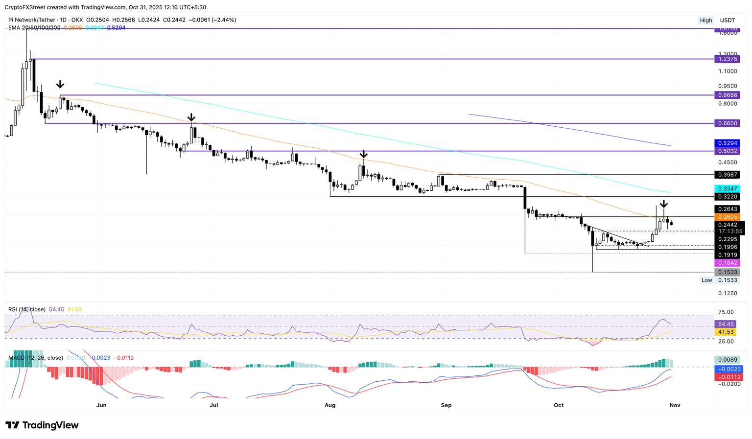 Pi Network股價(jià)第四次從均線回落,這條均線自5月以來一直構(gòu)成關(guān)鍵的動(dòng)態(tài)阻力位,此次回落可能抹去本周早些時(shí)候的漲幅。PI的直接支撐位在0.20美元整數(shù)關(guān)口和0.1919美元水平(10月11日低點(diǎn))。