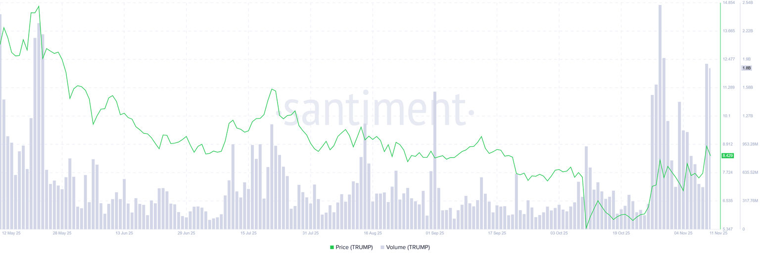Santiment 數(shù)據(jù)顯示,特朗普官方生態(tài)系統(tǒng)的交易量(鏈上所有交易應(yīng)用程序產(chǎn)生的總交易量)周二達(dá)到 18 億美元,創(chuàng)下 10 月底以來的最高水平。交易量的增長(zhǎng)表明交易者的興趣激增。流動(dòng)性在特朗普梗幣中,這增強(qiáng)了其看漲情緒。前景.