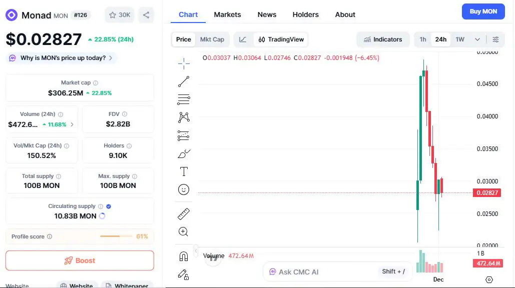 今日加密貨幣新聞再添喜訊:Monad 的公網(wǎng)將于 11 月 24 日正式上線。MON 代幣目前正在交易。12月2日左右約為0.028美元這表明,該股較其在 Coinbase 上的公開發(fā)售價(jià)格 0.020 美元上漲了約 80%。