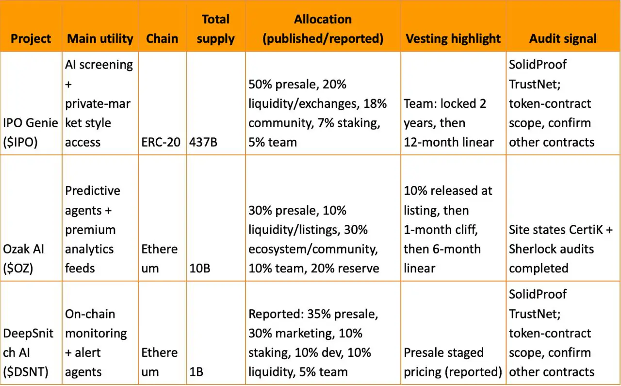IPOGenie、Ozak AI 和 Deepnitch AI 之間的比較,并揭示了 2026 年值得關注的早期 AI 代幣。因此,為此,我們盡可能使用官方代幣經(jīng)濟學頁面和審計儀表板,并標記任何僅“已報告”的內容。