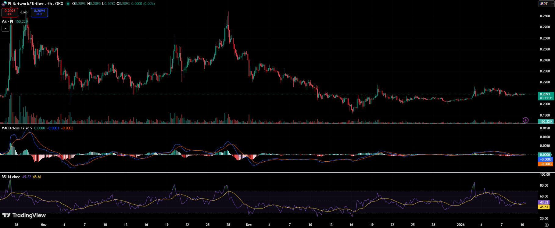 盡管技術(shù)層面有所進(jìn)展,但市場反應(yīng)平淡。在4小時(shí)圖上,Pi的交易價(jià)格在0.209美元附近,當(dāng)日波動(dòng)幅度極小,且遠(yuǎn)低于前期高點(diǎn)。