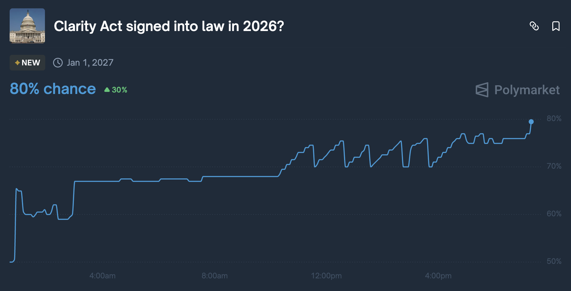 據(jù) Polymarket 稱(chēng),《CLARITY 法案》有 80% 的可能性在年底前簽署成為法律。