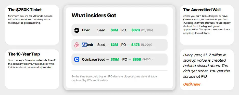 流動性期權、淘汰 97% 潛在投資者的認證要求,以及在有關系的個人之間私下分享交易的內(nèi)部網(wǎng)絡。這套體系并非為公平而設計,而是為了讓機會只局限于精英階層。IPO Genie 打破了這道壁壘。