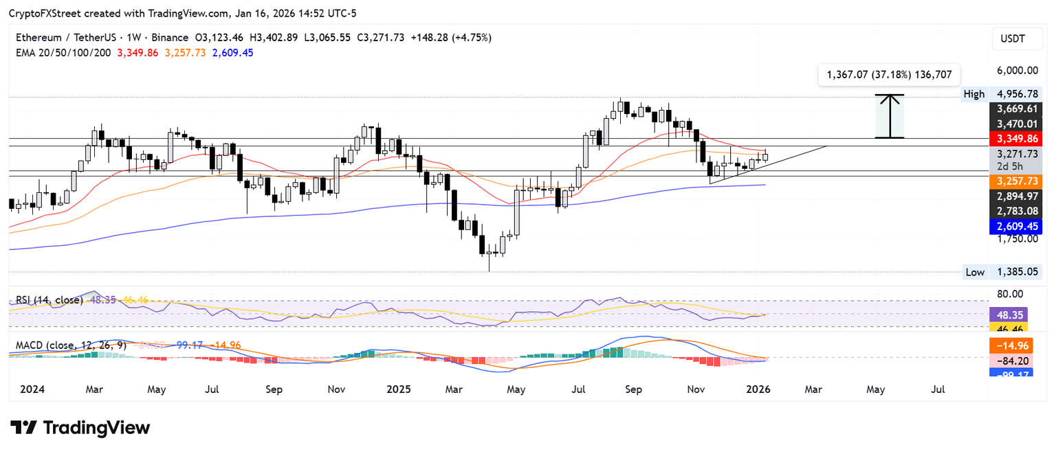以太坊 (ETH) 周線圖上呈現(xiàn)上升三角形形態(tài)。下行方面,一條自 11 月 17 日延伸而來(lái)的上升趨勢(shì)線為其提供支撐。若跌破該趨勢(shì)線,以太坊可能在 2890 美元附近找到支撐。