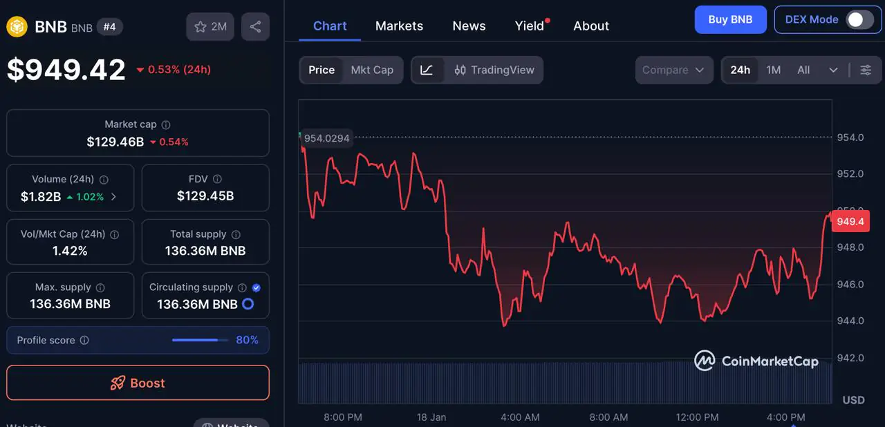 BNB 仍然是加密經(jīng)濟(jì)中的主導(dǎo)力量。截至撰稿時(shí),其價(jià)格接近 949 美元,日交易量約為 18.2 億美元,該資產(chǎn)持續(xù)受益于深度增長(zhǎng)。流動(dòng)性