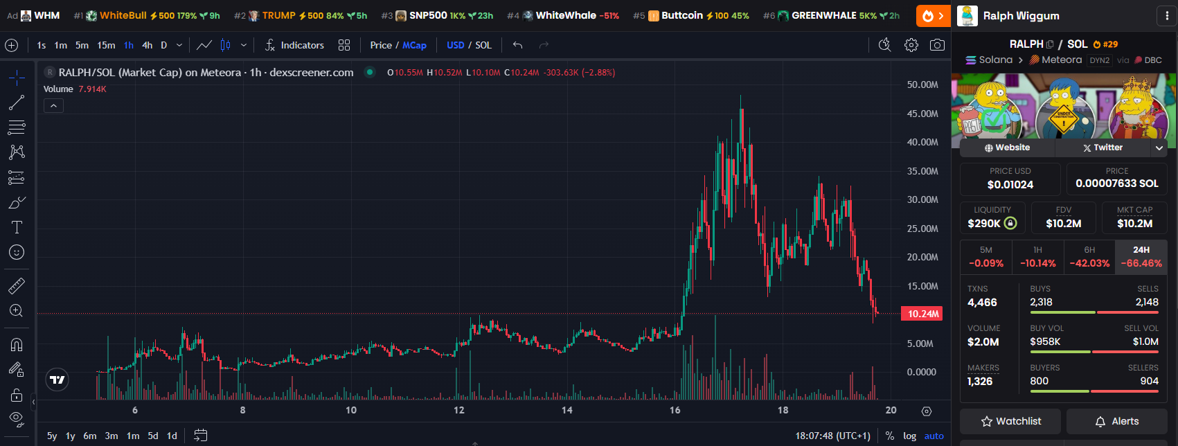 平臺上其他人工智能相關(guān)代幣也出現(xiàn)了類似的走勢。例如,與杰弗里·亨特利(Geoffrey Huntley)的拉爾夫·維格姆(Ralph Wiggum)循環(huán)編排模式相關(guān)的代幣$RALPH,最初表現(xiàn)良好,但隨后大幅回落。