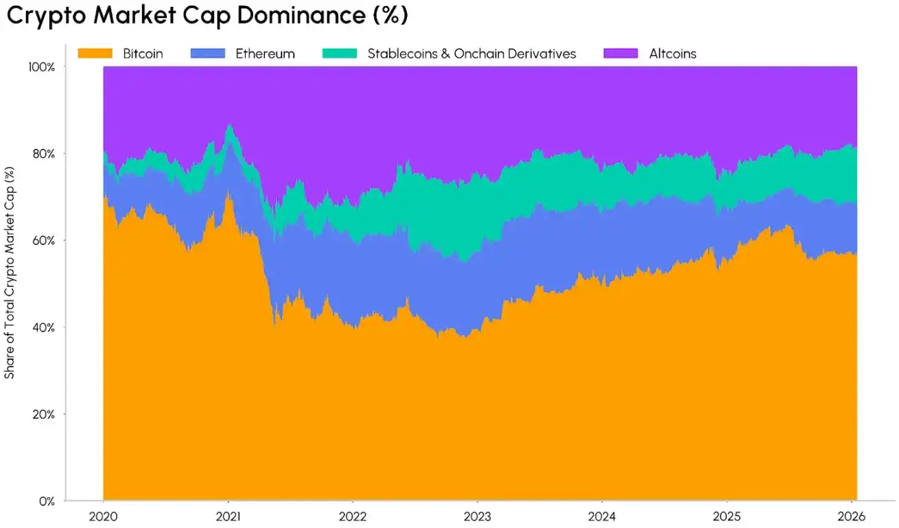 受此影響,山寨幣市場正面臨兩難困境。留存下來的可投資標的范圍不斷收窄,且頭部集聚效應愈發(fā)明顯:市場價值持續(xù)向流動性更高、發(fā)展更成熟的資產(chǎn)集中,這類資產(chǎn)往往具備清晰的應用場景、明確的監(jiān)管發(fā)展路徑,且能充分受益于穩(wěn)定幣、去中心化金融(DeFi)與資產(chǎn)代幣化的發(fā)展浪潮。