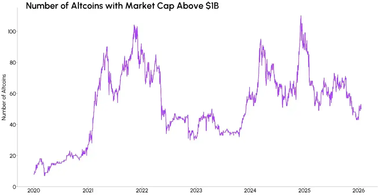 我們也可以通過突破特定市值門檻的代幣數(shù)量,來觀察這一集中化趨勢。盡管加密市場總市值屢創(chuàng)歷史新高,但市值超 10 億美元的山寨幣數(shù)量,已從 2021 年峰值時的約 105 種縮減至目前的約 58 種。這意味著,即便市場中的資產(chǎn)總量在增加,真正具備「可投資性」的山寨幣卻在不斷減少。盡管這并不代表山寨幣板塊將走向衰落,但市場資金的關注焦點,或?qū)⑦M一步向具備堅實基本面、抗風險能力更強的標的集聚。