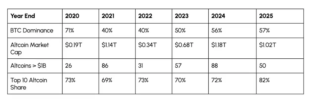 下表總結了上述市場趨勢的年度演變特征。部分指標仍呈現(xiàn)出周期性特征,例如比特幣的市場主導率在牛市回落、在熊市攀升,但市值前十山寨幣的市場占比卻走出了不同的趨勢:2020-2024 年,無論市場處于何種行情,該比例始終穩(wěn)定在 69%-73%,而 2025 年則大幅攀升至 82%。這一變化表明,市場正發(fā)生向成熟龍頭資產(chǎn)傾斜的結構性轉(zhuǎn)變,而非單純的短期「追漲優(yōu)質(zhì)資產(chǎn)」行為。