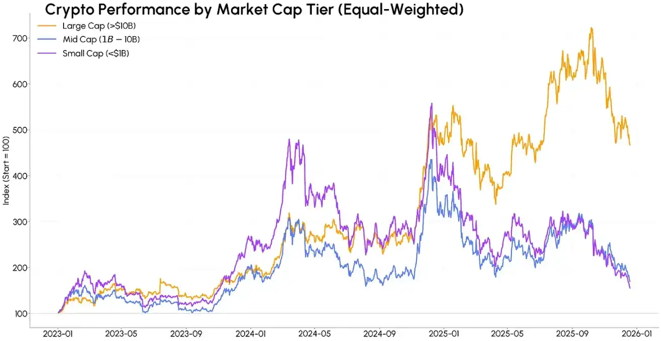 這一資本集中化趨勢也體現(xiàn)在資產(chǎn)收益表現(xiàn)上。2023 年以來,中盤幣(市值 10 億 - 100 億美元)、尤其是小盤幣(市值不足 10 億美元)曾在 2024 年的早、晚兩個階段跑贏大盤幣(市值超 100 億美元),但這一走勢在 2025 年發(fā)生了劇烈反轉(zhuǎn),背后原因是市場對 Meme 幣及其他短期敘事輪動的情緒快速消退。