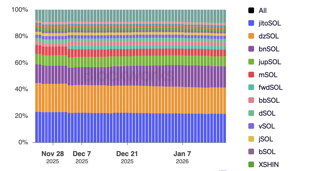 過去六個(gè)月,Marinade Select 以 SOL 計(jì)價(jià)的總價(jià)值已增長(zhǎng)了87.13%預(yù)計(jì)從 2025 年 7 月的 86.3 萬枚 Solana 代幣增至 2026 年 1 月的 160 萬枚 Solana 代幣。Solana ETF 的增長(zhǎng)支撐了這一增長(zhǎng),Canary Capital 等發(fā)行商選擇通過 Marinade Finance 質(zhì)押其 Solana 代幣。