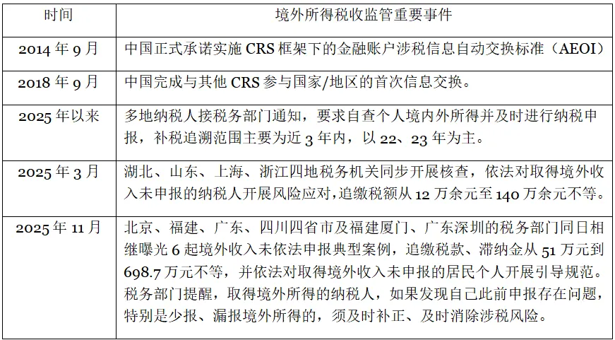 2026 年 1 月 15 日,據(jù)多家媒體報(bào)道,目前中國內(nèi)地稅務(wù)居民境外收入的補(bǔ)稅追溯期較此前拉長,最早可至 2020 年甚至 2017 年。2025 年以來,不少稅務(wù)居民接到稅務(wù)部門提示和通知,要求自查個(gè)人境內(nèi)外所得并及時(shí)進(jìn)行納稅申報(bào),補(bǔ)稅追溯范圍主要為近 3 年內(nèi),以 2022 年,2023 年為主。
