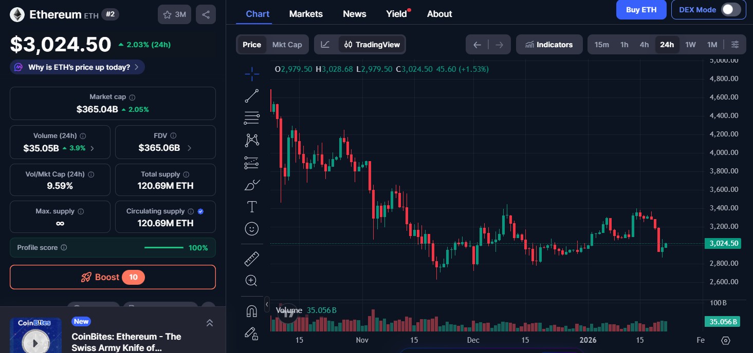 以太坊價格(ETH):3,026.35 美元,上漲 2.15%,市值:350.7 億美元。