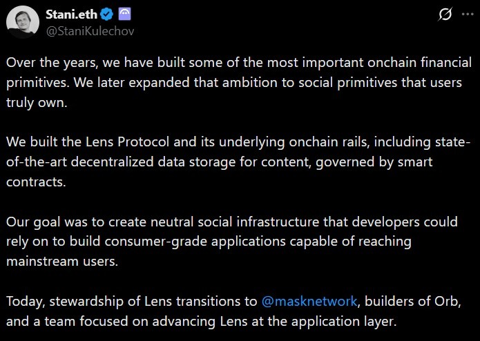 Lens 與 Aave 創(chuàng)始人 Stani Kulechov 的聲明證實了這一過渡。周二,Kulechov 在 X 上表示,Aave 的角色將收縮為技術(shù)顧問,未來將重心重新放在 DeFi 領(lǐng)域。