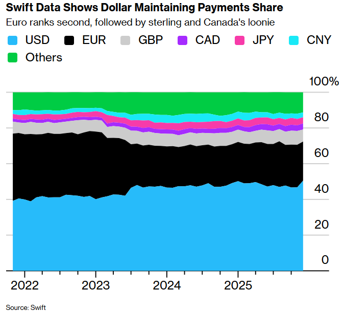 但這些數(shù)據(jù)支持了一個(gè)觀點(diǎn):盡管特朗普一年前上任以來(lái)引發(fā)了市場(chǎng)波動(dòng)和更深層的政策混亂,美元在國(guó)際金融和貿(mào)易中的作用依然健康。美元在全球支付中的份額上一次突破50%是在2025年1月。與此同時(shí),一項(xiàng)彭博美元指數(shù)在過(guò)去一年中下跌了超過(guò)7%。