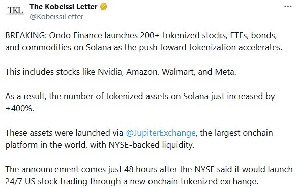 Ondo Finance 的代幣化資產(chǎn)遷移至 Solana 平臺意味著用戶現(xiàn)在可以直接在分布式網(wǎng)絡(luò)上交易股票和債券等傳統(tǒng)金融產(chǎn)品。Solana 最大的鏈上交易平臺 Jupiter 交易所利用紐約證券交易所支持的流動性,為這些資產(chǎn)的上線提供了支持。