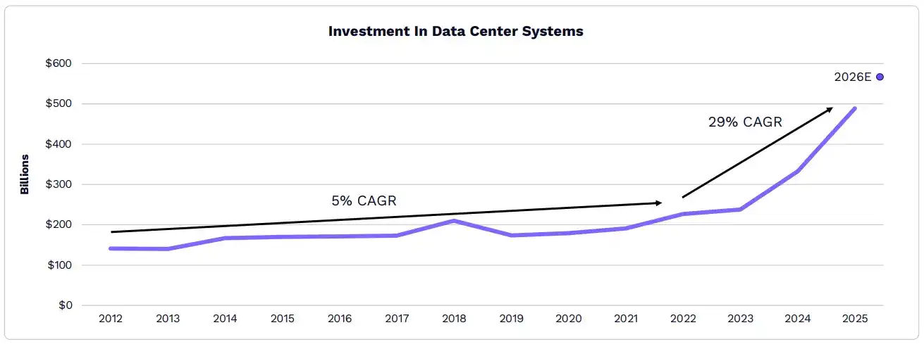 自「ChatGPT 時刻」以來,數(shù)據(jù)中心系統(tǒng)的增長速度已從 5% 加速至 29%,年增長率持續(xù)攀升。