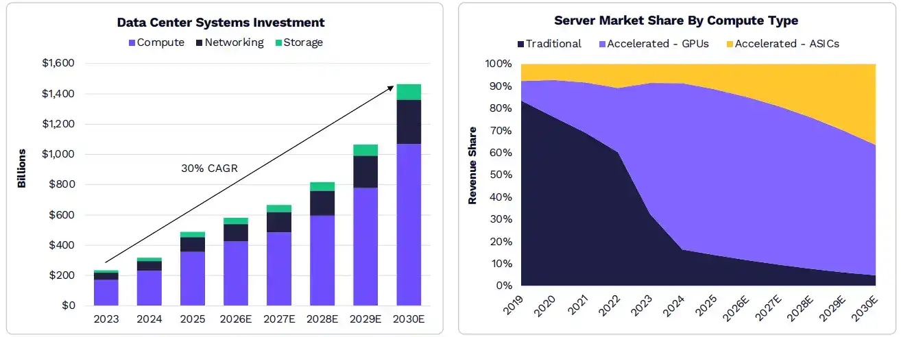 到 2025 年,數(shù)據(jù)中心系統(tǒng)的年度投資額約為 5000 億美元,幾乎是 2012 年至 2023 年平均水平的 2.5 倍。根據(jù) ARK 研究,此類投資將繼續(xù)增長,到 2030 年可能增長兩倍,達(dá)到約 1.4 萬億美元。
