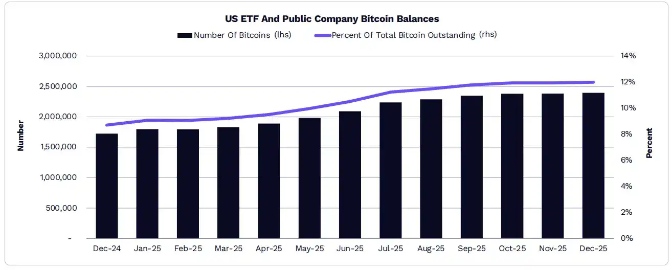 2025 年,比特幣 ETF 的持有量增長 19.7%,從約 112 萬枚增至約 129 萬枚;而上市公司持有的比特幣數(shù)量增長了 73%,從約 59.8 萬枚增至約 109 萬枚。因此,由 ETF 和上市公司持有的比特幣總量占比從 8.7% 上升至 12%。