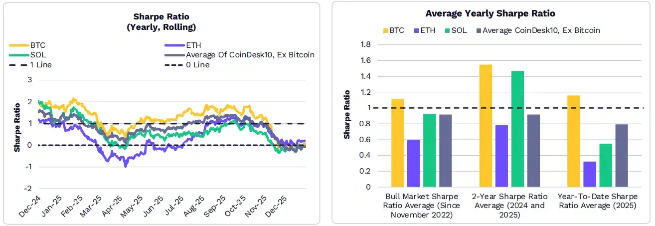 2025 年的大部分時間里,比特幣的風(fēng)險調(diào)整后收益超過了大多數(shù)其他市值較大的加密貨幣和指數(shù)。自最近一輪周期低點(diǎn)(2022 年 11 月)、2024 年初以及 2025 年初以來,比特幣的平均年化夏普比率也超過了以太坊、SOL 以及 CoinDesk 10 指數(shù)中其他九種成分幣的平均值。