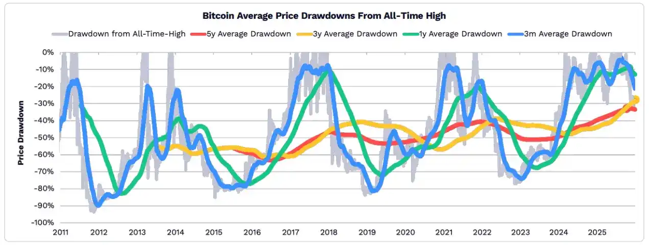 2025 年,比特幣價格相對于其歷史最高點(diǎn)的平均跌幅有所平緩。
