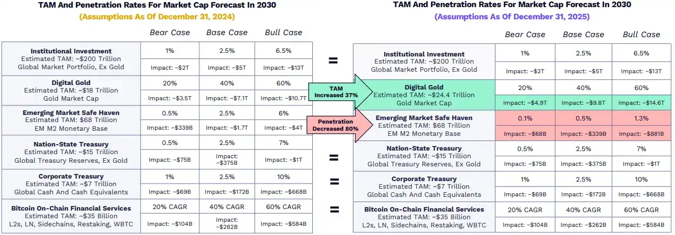 ARK 對 2030 年比特幣的預(yù)測一直相當(dāng)穩(wěn)定,只是有兩個假設(shè)因素發(fā)生了變化:作為數(shù)字黃金,在 2025 年黃金市值飆升 64.5% 后,其潛在市場(TAM)增長了 37%;作為新興市場避險資產(chǎn),其預(yù)測滲透率下降了 80%,以反映發(fā)展中國家對穩(wěn)定幣的迅速采用。