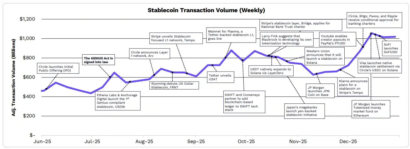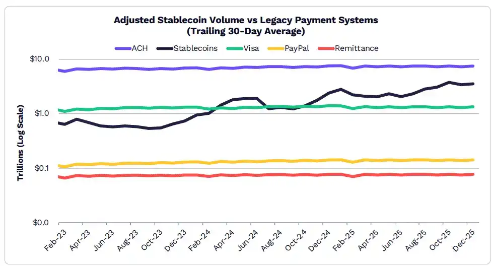 · 2025 年 12 月,穩(wěn)定幣交易量 30 天移動平均值為 3.5 萬億美元,是 Visa、PayPal 和匯款(Remittances)總值的 2.3 倍。