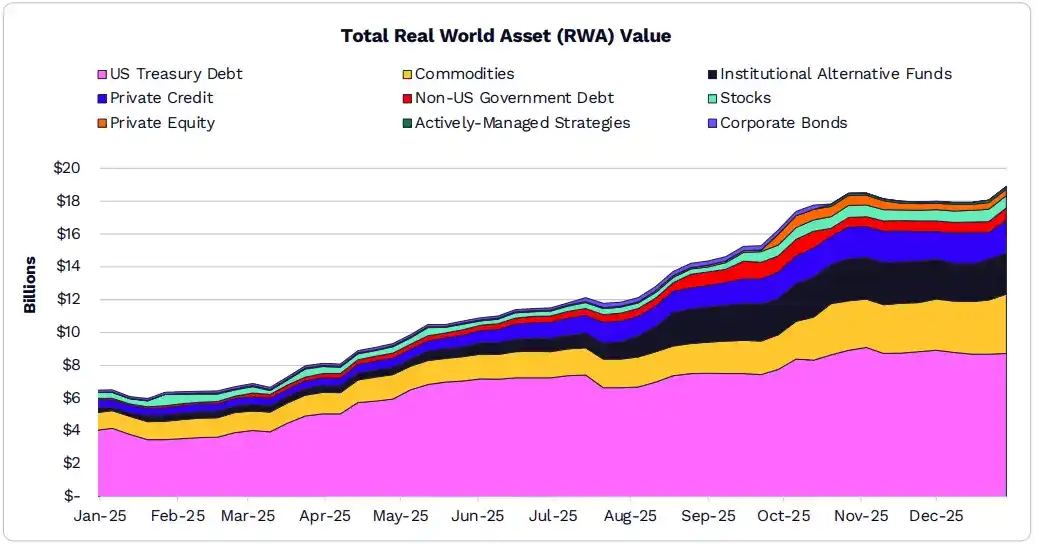 在以美國國債和大宗商品為主導(dǎo)的推動下,代幣化資產(chǎn)市場在 2025 年增長了兩倍,達(dá)到 190 億美元。