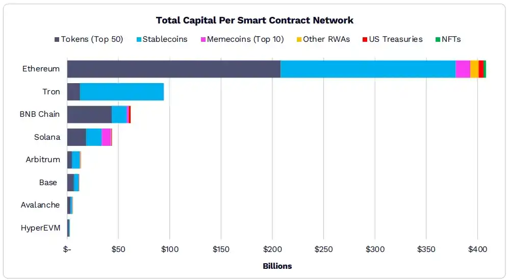 · 以太坊上的資產(chǎn)總值現(xiàn)已超 4000 億美元。在八大最熱門的區(qū)塊鏈中,有七條鏈的 90% 市值由中穩(wěn)定幣和排名前 50 的代幣支撐。