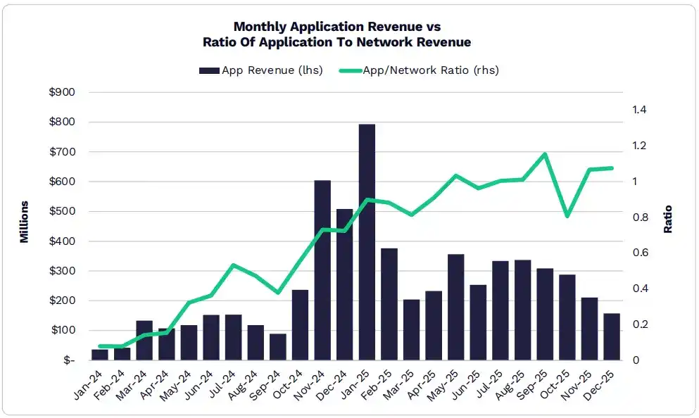 2025 年所有應(yīng)用收入的五分之一都來自 1 月份,這是有史以來最高的月度收入。如今,已有 70 個應(yīng)用程序和協(xié)議的月度經(jīng)常性收入 (MRR) 超過 100 萬美元。