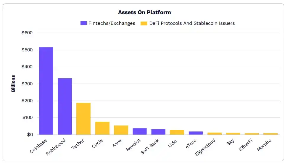 DeFi 和穩(wěn)定幣發(fā)行商的資產(chǎn)規(guī)模正在趕上許多金融科技公司。傳統(tǒng)金融科技平臺和加密原生平臺之間的資產(chǎn)規(guī)模差距正在縮小,這表明傳統(tǒng)和鏈上基礎(chǔ)設(shè)施正在融合。流動性質(zhì)押或借貸平臺等 DeFi 協(xié)議正在吸引機(jī)構(gòu)資本并迅速擴(kuò)張。