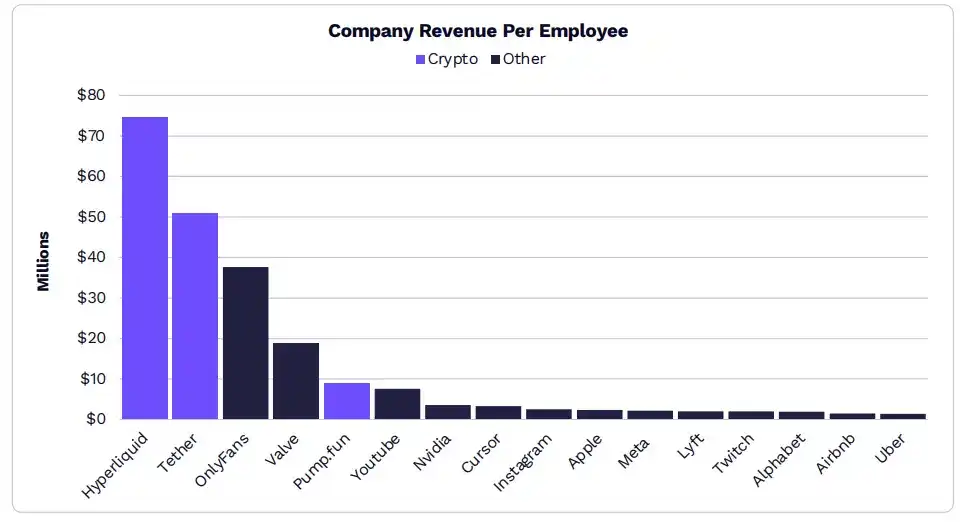 全球最具營收效率的公司包括 Hyperliquid、Tether 和 Pump.fun。到 2025 年,Hyperliquid 僅憑 15 名員工,就創(chuàng)造了超過 8 億美元的年收入。通過永續(xù)合約、穩(wěn)定幣和模因幣等鏈上垂直領(lǐng)域的布局,Hyperliquid 正以驚人的規(guī)模吸引用戶和資本,并擁有清晰的產(chǎn)品市場契合度。