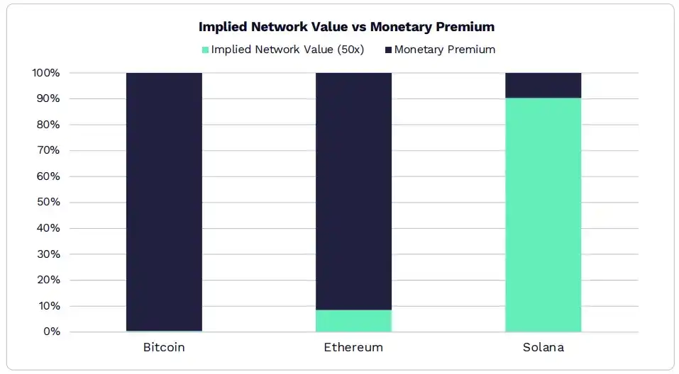 L1 網(wǎng)絡(luò)正從創(chuàng)收網(wǎng)絡(luò)演變?yōu)樨泿刨Y產(chǎn)。如果以基于 50 倍收入倍數(shù)推算,以太坊超過 90% 的市值都?xì)w功于其作為貨幣資產(chǎn)的角色。而 Solana 產(chǎn)生了 14 億美元的收入,證明其估值 90% 來自網(wǎng)絡(luò)效用。