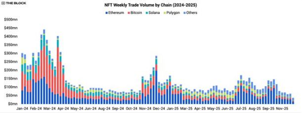 NFT 市場進入 2025 年時已顯頹勢,并且全年都未能扭轉(zhuǎn)下行趨勢。各個鏈上的交易量都在萎縮,市場活動越來越集中到少數(shù)幾個熱門 IP 和一些激勵計劃中,而絕大多數(shù) NFT 系列和細分賽道都乏人問津。數(shù)據(jù)清晰地反映了這種市場收縮:2025 年全年 NFT 總交易額僅為 55 億美元,遠低于 2024 年的水平,這充分說明該市場已從其巔峰大幅回落。