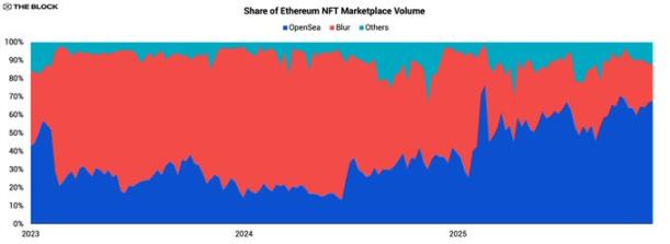 以 OpenSea 為例,最明顯的變化體現(xiàn)在以太坊 NFT 市場份額的逆轉(zhuǎn)上。在將榜首位置讓給 Blur 大約三年后,OpenSea 于 2025 年重奪第一,并在年內(nèi)顯著擴大了領(lǐng)先優(yōu)勢。