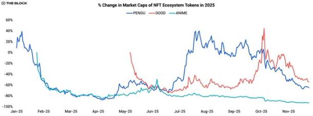 Azuki 的代幣 ANIME 則因其幾乎從未反彈而顯得突出。它在 2025 年 1 月下旬推出后不久便下跌,并且與 PENGU 或 DOOD 不同,從未經(jīng)歷有意義的上漲期。其價格在整個年度內(nèi)持續(xù)陰跌,目前年內(nèi)跌幅超過 90%,是三大 NFT 生態(tài)代幣中表現(xiàn)最差的。市場對「文化幣」的普遍疲憊似乎完全蓋過了最初的好奇心。